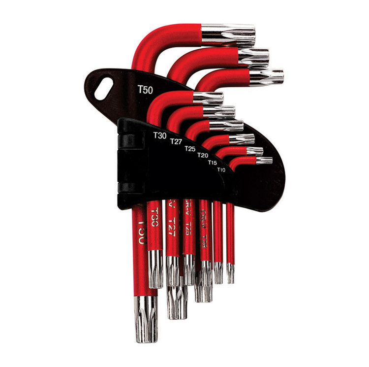 - شامل 9 عدد آچار آلن دسته کوتاه ستاره ای سوراخ دار در ابعاد T-10 , T-15 , T-20 , T-25 , T-27 , T-30 , T-40 , T-45 , T-50