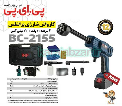 تولیدات برقی و شارژی برند پی ای پی PAP کارواش 15 بار شارژی بههمراه اوازم جانبی کامل قابلیت شستشو و تمیزکاری سریع و آبیاری آسان محصولی جدید با طراحی جدید و کاملا ارگونومیک دارای بدنهای مقاوم در برابر ضربه و آسیبهای احتمالی تولیدشده با باتری 21 ولت 3000 میلیآمپر مجهز به موتور نسل جدید بدون ذغال (Brushless) طراحی شده با موتور 3 سرعته دارای مخزن شوینده و نازل با 6 حالت مختلف پاشش آب حداکثر دمای ورودی آب برابر با 40 درجه سانتیگراد مجهز به قفل کن کلید و نشانگر میزان شارژ باتری دارای شیلنگ فشار قوی 5 متری از نوع PVC امکان تنظیم فشار خروجی توسط کلید گازی حداکثر فشار خروجی آب برابر با 15 بار حداکثر فشار ورودی آب برابر با 4 بار جریان آب خروجی 5.5 لیتر در دقیقه به همراه نازل،شیلنگ 5 متری،شیر اتصال،کیف BMC و… با وزن بسیار سبک 1700 گرم