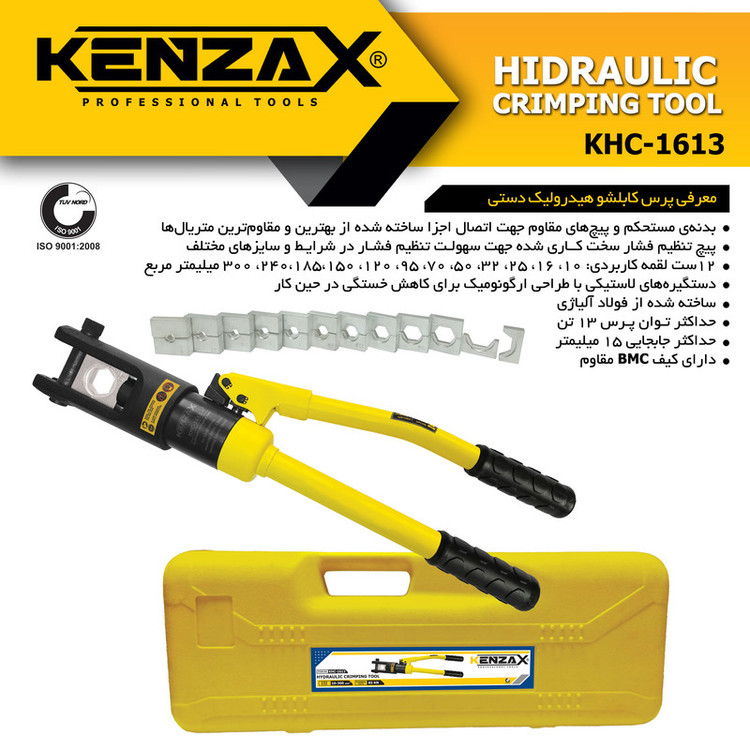 پرس کابلشو اﺑﺰاری اﺳﺖ ﺑﺮای اﯾﺠﺎد ﯾﮏ اﺗﺼﺎل ﻣﺤﮑﻢ و ﻣﻘﺎوم ﺑﯿﻦ اﺗﺼﺎﻻت ﺑﺮﻗﯽ و ﻫﺎدی ﺑﺮق، ﮐﻪ اﯾﻦ ﮐﺎر را در ﮐﻤﺘﺮﯾﻦ زﻣﺎن ﻣﻤﮑﻦ و ﺑﻬﺘﺮﯾﻦ ﺷﺮاﯾﻂ ﺑﺮای اﺗﺼﺎل ﻫﺎدی اﻧﺠﺎم ﻣﯽ دﻫﺪ. ابزار پرس هیدرولیک کابلشو کنزاکس KHC-1613 جهت نصب اتصالات کابلشو /رابط مسی از سایز (سطح مقطع) 10 الی 300 میلیمتر مربع به کابل، مورد استفاده قرار می گیرد. در ابزار پرس هیدورلیک کابلشو، از روغن جهت انتقال نیروی مکانیکی دست اپراتور به اجزاء متحرک ابزار (مانند شفت و پیستون) اسـتفاده می گردد. ابزار در جعبه ای قفل شـو از جنس پلاستیـک سـخت، به همراه 12 عدد قالب پرس در سایز های 10، 16، 25، 32، 50، 70، 95، 120، 240،185،150، 300 عرضــه می گردد.