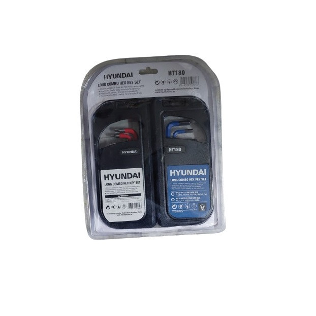 مجموعه آلن شش گوش و ستاره ای فوق بلند هیوندای دارای 9عدد آلن شش گوش ته گرد به شماره های 1.5،2،2.5،3،4،5،6،8،10 میلی متر و 9عدد آلن ستاره ای سوراخ دار به شماره های T10,T15,T20,T25,T27,T30,T40,T45,T50 می باشد.ساخته شده از آلیاژکروم وانادیوم می باشد